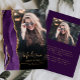 Este anúncio de graduação de 2025 apresenta uma borda geodórica de agata de aquarela em tons de roxo com realces falsos de brilho dourado. O primeiro nome do formando aparece como uma camada elegante de escrita manual dourada em uma foto vertical, juntamente com o sobrenome, a escola e o ano de aula em letra de impressão. Um filtro de gradiente preto ajuda o pop de texto. Uma segunda foto horizontal aparece no verso, juntamente com o anúncio e os detalhes em texto dourado sobre fundo roxo de ameixa.