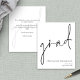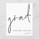 Um orçamento com preço menor (4,5 x 5,6") em um semibrilho que é um estoque de cartão de 110 gsm, semelhante em espessura a um postal. POR FAVOR, NOTE que existe UM por folha. Os envelopes são um extra opcional e são ligeiramente maiores que o tamanho da placa. Anúncio de Formando de Script de Orçamento Este simples design de monocromo para anunciar a notícia do seu formando tem um script de escrita manual de conjunto informal para o cabeçalho principal, formando e personalização fácil da tipografia no canto inferior direito com seus detalhes e também sua mensagem no verso.