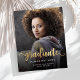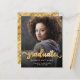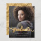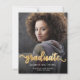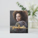 Anúncio de graduação moderno com uma foto vertical personalizada. A palavra "formando" aparece na escrita em folha de alumínio dourada com cinzas decorativas encaracoladas no início e no fim. Adicione o nome do formando, a escola e o ano de graduação abaixo em fontes brancas sans serif. Substitua facilmente a imagem de amostra pela foto do seu próprio formando. Uma tela de gradiente preto ajuda a garantir que o texto seja pop. A parte traseira apresenta um padrão de bolinhas de folha falsa dourada. Ideal para segundo grau ou formandos.