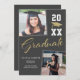 Anuncie a grande realização do seu formando com estes modernos anúncios de graduação com duas fotos. Personalize a data de graduação com sua própria cor e fonte. Este design apresenta sotaques dourados falsos. Os detalhes e as fotos adicionais podem ser adicionados no verso, incluindo detalhes da festa.