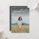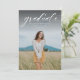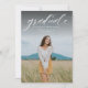 Um simples script clássico "formando" em branco acentua uma foto vertical solteiro do seu formando. Este anúncio de graduação funciona tanto para formandos da faculdade quanto para segundos graus e é simples o suficiente para deixar sua foto brilhar. É um design de eterno e também apresenta um backer distribuído com uma cor personalizável (o padrão é uma cinza de carvão clássico). As palavras estão no topo da foto, mas a design também está disponível com as palavras no fundo.