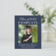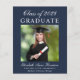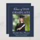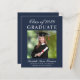 Anúncio de formandos azul-escuro e econômico com a foto do formando, seu nome e ano de aula em uma escritura branca elegante e sua universidade, grande e honraria na tipografia branca moderna.