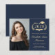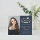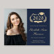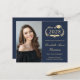 Anúncio de formandos azul escuro, moderno e econômico, com "Classe de" numa ilustração dourada clara da coroa de louros que incorpora um boné de formando superior e diploma, uma fotografia do formando e o seu nome numa elegante escrita dourada clara. Adicione sua escola, major, honras ou planos futuros. Este papel semirbrilhante do orçamento é semelhante em peso ao papel fotográfico. Também está disponível uma versão maior do estoque de cartão tradicional 5x7 (mensagem para o link).