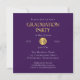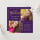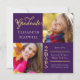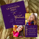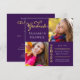 Púrpura quadrada elegante e elegante e tom dourado, dois anúncios de graduação de fotos e design de convite de festas. Apresenta a palavra "Formando" em textos de tom dourado com script e o ano "2022" em textos de tom dourado vertical na frente com suas fotos em cantos opostos. Os campos são fornecidos para o nome do formando, data de conclusão da licenciatura, escola, universidade ou universidade e planos futuros na frente. Na parte de trás está um design de convite para festas de formatura, também com sotaques dourados. Design por Holiday Hearts Design (direitos reservados).