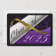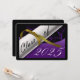 Cartão de graduação em roxo e ouro com diploma e ano de graduação. O fundo é um fundo preto com letras douradas para os anúncios de graduação.