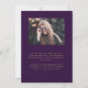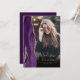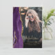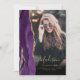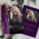 Este convite de formatura da moda de 2025 apresenta uma borda de geodo de água-forte em tons de roxo com destaques de brilho dourado falso. O primeiro nome do graduado aparece como uma sobreposição de escrita à mão em dourado elegante em uma foto vertical, junto com o sobrenome, escola e ano de turma em fonte copperplate. Um filtro gradiente preto ajuda o texto a se destacar. Uma segunda foto horizontal aparece no verso, junto com o anúncio e os detalhes em texto dourado em um fundo roxo escuro.
