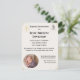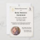 O design apresenta a imagem de uma cruz dourada com as letras IHS sobre ela no canto superior esquerdo. (Símbolo católico para Cristo) O canto superior direito exibe a imagem de uma pomba e uma aspersão de água. Na parte inferior esquerda apresenta a foto que você fornece em forma circular. Os fundos da frente e do verso são de cor creme. Os cantos da frente têm uma aparência aerografada. Muito elegante. Perfeito para anunciar o Batismo do seu pequeno. Todo o texto é personalizável. Também disponível em branco.