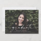 Este anúncio de formatura com foto full bleed apresenta a palavra "graduado" escrita em script branco na frente. Tem espaço para o nome do formando, ano de conclusão e escola. O verso do cartão pode ser usado para uma mensagem pessoal ou detalhes do convite para a festa de formatura.