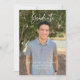Um cartão de anúncio de formatura de graduado em Script Moderno com fonte de script moderna, foto de retrato com sangria total na frente com nome, informações da turma e detalhes da escola. O verso tem uma segunda foto com detalhes adicionais.