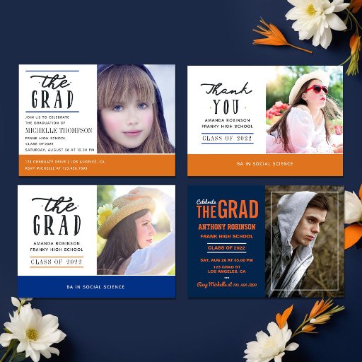 Cartão de anúncio de graduação em laranja e azul personalizável para suas especificações. É recomendado um formato quadrado para a foto frontal e o cenário para o contrário.