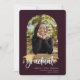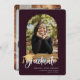 Script branco reproduzível com destaque para o boné de formatura do ouro, anúncio de graduação de fotos em arco. Recursos, fundo de cor roxa escura.