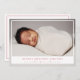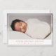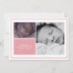 Anúncio de nascimento de bebê com uma grande foto cercada por um quadro branco limpo, sobre o qual você pode adicionar os nomes do bebê e estatísticas de natalidade em fontes cor-de-rosa. Nas costas, adicione mais duas fotos e por quem o bebê é bem-vindo.