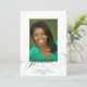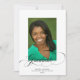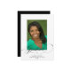 Um anúncio de graduação simples, mas elegante, que inclui uma foto do formando sobreposta com a palavra "formando" em uma escrita cursiva elegante preta, e detalhes de graduação por baixo. O fundo está em branco, e o reverso está em preto.