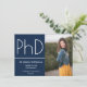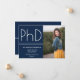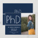 Um anúncio para um formando de doutorado. Esta design minimalista é azul e branca. A foto é uma modelo que deve ser trocada por você. Todas as palavras e ambas as cores podem ser personalizadas. <i>Fotografia © Storytree Studios, Stanford, CA</i>