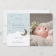 O anúncio de nascimento de um bebê bonito apresenta um fundo azul claro com estrelas falsas de ouro, lua crescente e nuvens brancas. O verso apresenta padrões de pontos aleatórios dourados falsos em fundo branco. Personalize para suas necessidades. Você pode encontrar mais produtos correspondentes na minha loja.