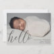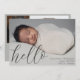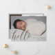 Este é um modelo de anúncio de bebê simples, moderno e chique. Na frente está o espaço para sua foto favorita do tamanho do cheio com uma camada elegante de caligrafia 'oi'. Ao contrário, há espaço para mais duas fotos e uma mensagem pessoal. Personalize com facilidade essa manutenção exclusiva para que a família e os amigos possam usufruir por anos.