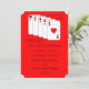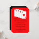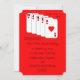 Este anúncio de fuga romântica apresenta um Royal Flush de copas, claro. À direita das cartas, as palavras "Estava nas cartas!" aparecem. Abaixo das cartas, você pode personalizar todos os detalhes da sua fuga romântica. As cartas aparecem em um fundo vermelho com o verso do convite sendo preto. Uma ótima maneira de anunciar seu casamento. Copyright henishouseofpaper