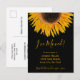 Cartão postal de anúncio vertical de país com girassol amarelo em fundo preto se movendo. Envie seu novo endereço para amigos e familiares. Design floral rústico elegante e lindo. Direitos autorais da imagem Marg Seregelyi Photography.