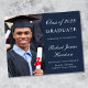 Anúncio de formandos azul escuro, simples e moderno, favorável ao orçamento, com uma foto do formando, seu nome e ano de aula em um roteiro elegante branco e sua universidade, major e honrosa.