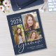 Anúncio de graduação em azul escuro e econômico apresentando uma colagem de fotos de 3 fotos e um "Formando" em um roteiro em branco de na moda. Acrescentar o nome do formando, ano de aula e escola ou universidade na tipografia moderna.