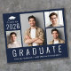 Anúncio de graduação mínimo e amigável em azul-escuro, com orçamento, apresentando uma colagem de 4 fotos, "Formando" escrito em letras grandes brancas e seu ano de aula, nome e escola ou universidade em tipografia simples e branca.
