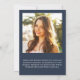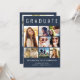 Elegante anúncio de graduação azul escuro para celebrar o graduado, apresentando "GRADUADO" no topo em tipografia branca grande, uma colagem de sete fotos e seu nome, ano de turma e escola em tipografia branca moderna. No verso, adicione uma foto adicional e uma mensagem personalizada.