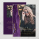 Este convite de formatura da moda de 2025 apresenta uma borda de geodo de água-forte em tons de roxo com destaques de brilho dourado falso. O primeiro nome do graduado aparece como uma sobreposição de texto manuscrito dourado elegante em uma foto vertical, junto com o sobrenome, escola e ano de turma em fonte copperplate. Um filtro gradiente preto ajuda o texto a se destacar. Uma segunda foto horizontal aparece no verso, junto com o anúncio e detalhes em texto dourado em um fundo roxo escuro.