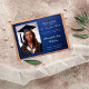 Este cartão de lançamento de graduação apresenta uma foto personalizável. A placa tem um design azul e ouro elegante com texto decorativo anunciando a graduação para um formando Classe 2025. Também inclui uma área personalizável para os nomes dos pais, a futura universidade do formando e uma foto no verso. O layout é formal e comemorativo, perfeito para compartilhar um marco orgulhoso com a família e os amigos.