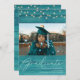 Anuncie sua graduação com fotos em madeira azul suja e luzes de cordas para um tipo de sentimento de festa. Use qualquer foto vertical ou horizontal