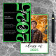 Moderno e mínimo, esse anúncio de graduação faz uma declaração combinando preto clássico e branco com sotaques de verde limão. É design mínimo é um design simples e divertido para celebrar o grande evento do formando. O verso exibe a foto favorita do seu formando. Criado pela imprensa simplesmente de farmácia.
