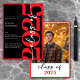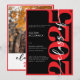 Moderno e mínimo, esse anúncio de graduação faz uma declaração combinando preto clássico e branco com acentos de vermelho. É design mínimo é um design simples e divertido para celebrar o grande evento do formando. O verso exibe a foto favorita do seu formando. Criado pela imprensa simplesmente de farmácia.