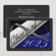 Cartão de graduação azul e prata com diploma e ano de graduação. O verso é uma cinza com letras brancas para os anúncios de graduação.