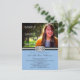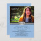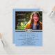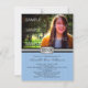 Um anúncio festa de formatura que certamente será lembrado. A foto do formando é colocada acima de uma fivela de prata contendo o ano de graduação. Todas as impressões de informações personalizadas contra um elegante fundo azul pínstripe. Disponível em cores alternativas com produtos correspondentes. com