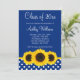 Lindos girassóis amarelos com padrão de bolinhas azul e branco estão representados neste convite de graduação temático do país. Perfeito para um segundo grau de graduação, formandos ou convite de festa de formatura.