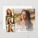 Anúncio de graduação elegante, de fácil orçamento, com a foto do formando sobreposta com uma faixa de três fotos quadradas menores, "formando" em uma escrita moderna e seu nome e ano de aula em uma simples tipografia.
