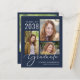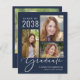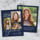 Anúncio de graduação azul, de fácil orçamento, com 3 colagens de fotos e "Formando" em um elegante roteiro branco. Adicione o nome do formando, ano de aula e escola ou universidade em uma simples tipografia branca moderna. No verso, adicione uma foto adicional e sua mensagem personalizada. Este papel semirbrilhante do orçamento é semelhante em peso ao papel fotográfico. Também está disponível uma versão maior do estoque de cartão tradicional 5x7 (mensagem para o link).
