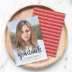 Anuncie sua formatura com este anúncio de graduação em na moda com a palavra "Formando" em um roteiro de tendências em azul contra um gradiente branco parcialmente transparente. A placa tem um padrão de listras brancas contra um fundo vermelho. Personalize-o substituindo o texto do marcador de posição e substitua a foto do marcador de amostra/marcador de posição por sua própria foto. Para obter mais opções, como alterar a fonte, o tamanho/cor do texto ou o espaçamento entre letras, clique no botão "Personalizar". *Observe que a Marca d'água Zazzle que aparece na visualização de zoom NÃO aparecerá no produto impresso final © Rosewood e Citrus