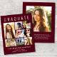 Anúncio de graduação vermelho de burgundy escura, amigável em orçamento, com "FORMANDO" no topo em grande tipografia branca, uma colagem de sete fotos e seu nome, ano de aula e escola em tipografia branca moderna. No verso, adicione uma foto adicional e uma mensagem personalizada.