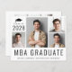 Anúncio de graduação de mestrados de MBA modernos e amigável em orçamento, com uma colagem de 4 fotos, "Formando MBA" escrito em letras maiúsculas e seu ano de aula, nome e escola ou universidade em tipografia simples. No verso, adicione uma foto adicional e uma mensagem personalizada.