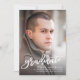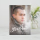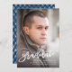 Anuncie sua graduação com este anúncio de graduação em foto-na moda com a palavra "Formando" em um roteiro de pincel em branco contra um gradiente escuro parcialmente transparente para contraste. A placa tem um padrão azul e branco atrás. Personalize-o substituindo o texto do marcador de posição e substitua a foto do marcador de amostra/marcador de posição por sua própria foto. Para obter mais opções, como alterar a fonte, o tamanho/cor do texto ou o espaçamento entre letras, clique no botão "Personalizar". *Observe que a Marca d'água Zazzle que aparece na visualização de zoom NÃO aparecerá no produto impresso final © Rosewood e Citrus