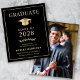 Anúncio de graduação em preto elegante e acessível com boné de ouro e tipografia de ouro leve moderna para o nome do formando, ano de aula, escola, universidade ou universidade, grau e grande ou honras. A foto do formando preenche a parte de trás.