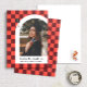 Este anúncio de graduação moderno e único apresenta um fundo vermelho-vivo e coral destacando uma fotografia do formando enquadrada em um arco branco com o nome do formando e a escola embaixo. Um pequeno boné de gradação é exibido de forma inteligente no fundo verificado com o ano de graduação do formando. As costas têm um padrão verificado divertido em cor-de-rosa e marrom de salmão.