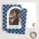 Este anúncio de graduação moderno e único apresenta um fundo azul e preto de piscar de olhos, destacando uma fotografia do formando enquadrado em um arco branco com o nome do formando e a escola embaixo. Um pequeno boné de gradação é exibido de forma inteligente no fundo verificado com o ano de graduação do formando. A parte de trás tem um padrão verificado e divertido em azul e preto.