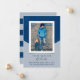Anúncio de fotografia de graduação moderna com um fundo geométrico inclinado. A parte azul do fundo tem uma textura rica. A foto tira o palco central com uma grande borda branca e uma sutil sombra por baixo. Design único perfeito para um segundo grau ou formandos.