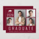 Anúncio de graduação mínima vermelho de burgundy, acessível ao orçamento, com 4 fotos coladas, "Formando" escrito em letras brancas grandes e seu ano de aula, nome e escola ou universidade em tipografia branca simples.