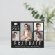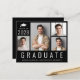 Anúncio de graduação em preto moderno e amigável do ponto de vista orçamental, com uma colagem de 4 fotos, "Formando" escrito em letras brancas grandes e o seu ano de aula, nome e escola ou universidade em tipografia branca simples.