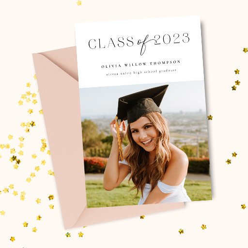 Um anúncio de graduação simples e clássico para a sua classe de formando 2023. Este design apresenta uma paleta de cores azul e branca e uma foto. O verso deste anúncio tem espaço para as suas informações de festa de formatura.