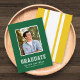 Este cartão de anúncio de graduação de fotos do estilo varsity tem cores de fundo editáveis. Para alterar a cor do plano de fundo frontal, selecione a camada "GraduationFront2" e altere sua cor. Para alterar a cor de fundo, selecione o plano de fundo e altere a cor.Esta é uma forma excelente de corresponder o seu anúncio às cores da sua escola. Personalize-o substituindo o texto do marcador de posição e substitua a foto do marcador de amostra/marcador de posição por sua própria foto. Para obter mais opções, como alterar a fonte e seu tamanho/cor ou o espaçamento entre letras, clique no botão "Personalizar". *Observe que a Marca d'água do Zazzle que aparece na visualização de zoom NÃO aparecerá no produto impresso final. © Rosewood e Citrus