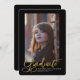 modelo de cartão de anúncio de graduação elegante e moderno para formandos de segundo grau ou de faculdade! Você pode adicionar sua foto no meio. Há uma sobreposição de texto em fonte faux gold script que diz "Formando" em um plano de fundo preto. Personalize este produto adicionando o nome do formando, a escola, a data de conclusão.