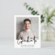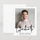 Anúncio de graduação moderno e amigável em orçamento com sua foto e "Formando" em um roteiro na moda ousado. Adicione o nome do formando, a escola e o ano de aula em tipografia simples.